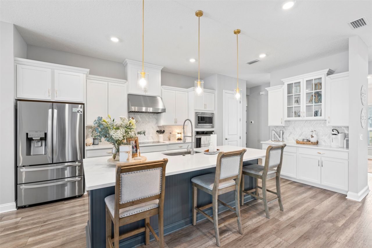 Immaculate is an understatement for how this home shows! From the moment you step inside, you'll notice the custom lighting throughout and the stunning gourmet kitchen featuring a wall oven/microwave combo, cooktop, coffee bar, and stylish cabinetry hardware that truly sets this home apart. Large sliders frame beautiful palm tree views, while light, airy colors create the ultimate clean coastal vibe. Offering over 2,700 square feet, this thoughtfully designed split floor plan includes 4 bedrooms, 3 full bathrooms, a private office, formal dining room, and eat-in kitchen. The spacious primary suite boasts his and hers walk-in closets, and luxury vinyl plank flooring flows through the main living areas, with cozy carpet in the bedrooms. A generous laundry room with built-in drop station adds everyday convenience. The main garage is a courtyard entry and features Shark Coating epoxy flooring, and on the opposite side of the home you'll find a large, easily accessible storage room (accessible from the inside of the home and out) that could easily be converted into a single-bay garage. Enjoy peaceful living on a no-through-traffic cul-de-sac street, outside of a flood zone. Located in the private, gated SEDA Homes community of Sandy Pointe Preserve, residents enjoy low HOA fees and no CDD fees. Just minutes from Amelia Island's beautiful beaches (approximately 5 miles away), luxury resorts, historic downtown Fernandina's charming shops and restaurants, and only 20 miles to JAX International Airport. Zoned for highly rated Nassau County schools, this home offers comfort, convenience, and coastal charm all in one.